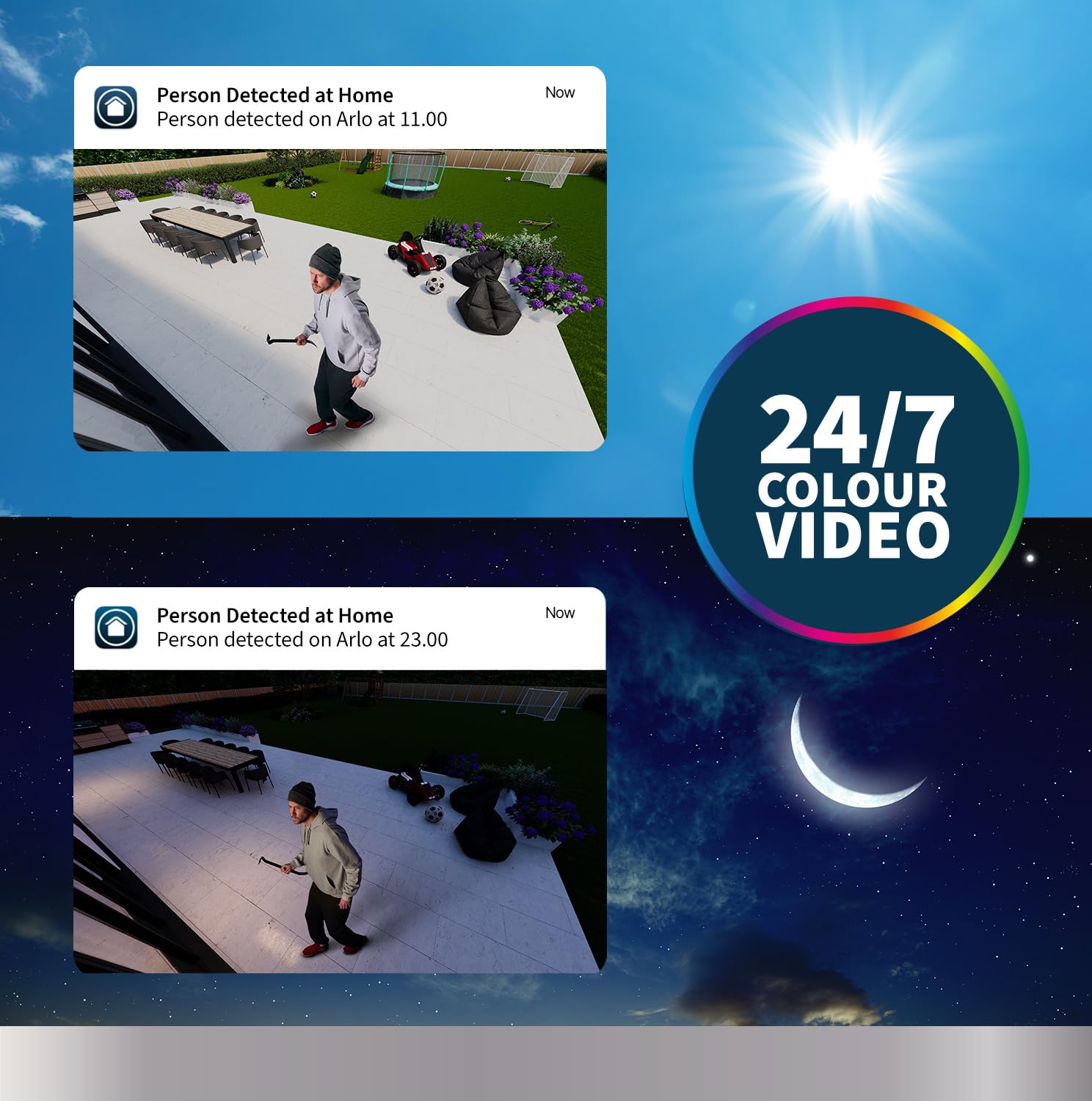 - COLOUR NIGHT VISION + 6 MONTHS* BATTERY: Our outdoor security camera with bright lighting comes with 2K HD resolution video; Our wireless outdoor security camera system has a long life rechargeable battery pack (dependent on usage); Or, you can use a solar panel (sold separately) to create a solar security camera