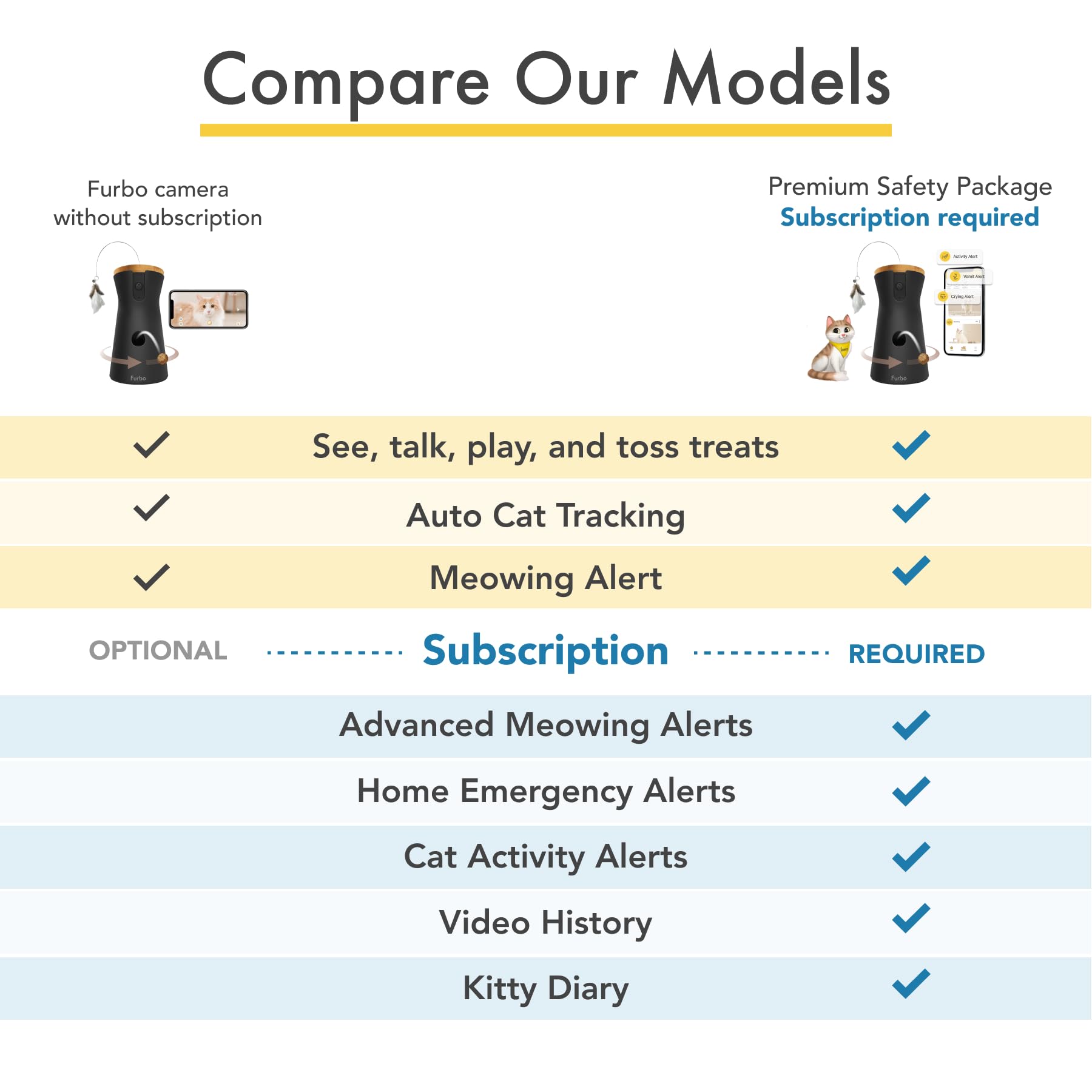 - REAL-TIME SMART ALERTS - Smart alerts give you reliable insight into what’s happening at home. Furbo’s MEOWING SENSOR detects when your cat is meowing and sends push notifications to your smartphone. Get additional alerts such as Continuous Meowing Alert, Vomit Alert, Home Emergency Alert, and many more, to avoid home emergencies and accidents with an optional Furbo Cat Nanny subscription. Every camera comes with a 30-day trial.
