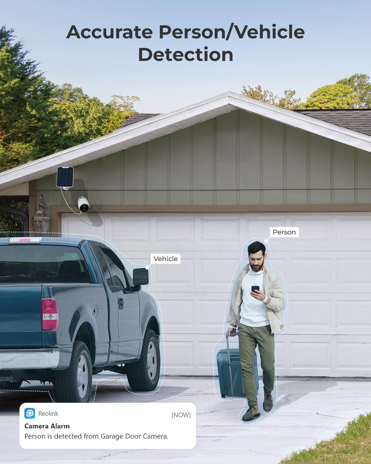 - INTELLIGENT DETECTION INSTANT ALERTS: Featuring intelligent person/vehicle detection, this solar security camera identifies reaI threats and reduces false alerts. You can receive specific notifications and instantly know what's triggering alerts just by looking at your phone screen
