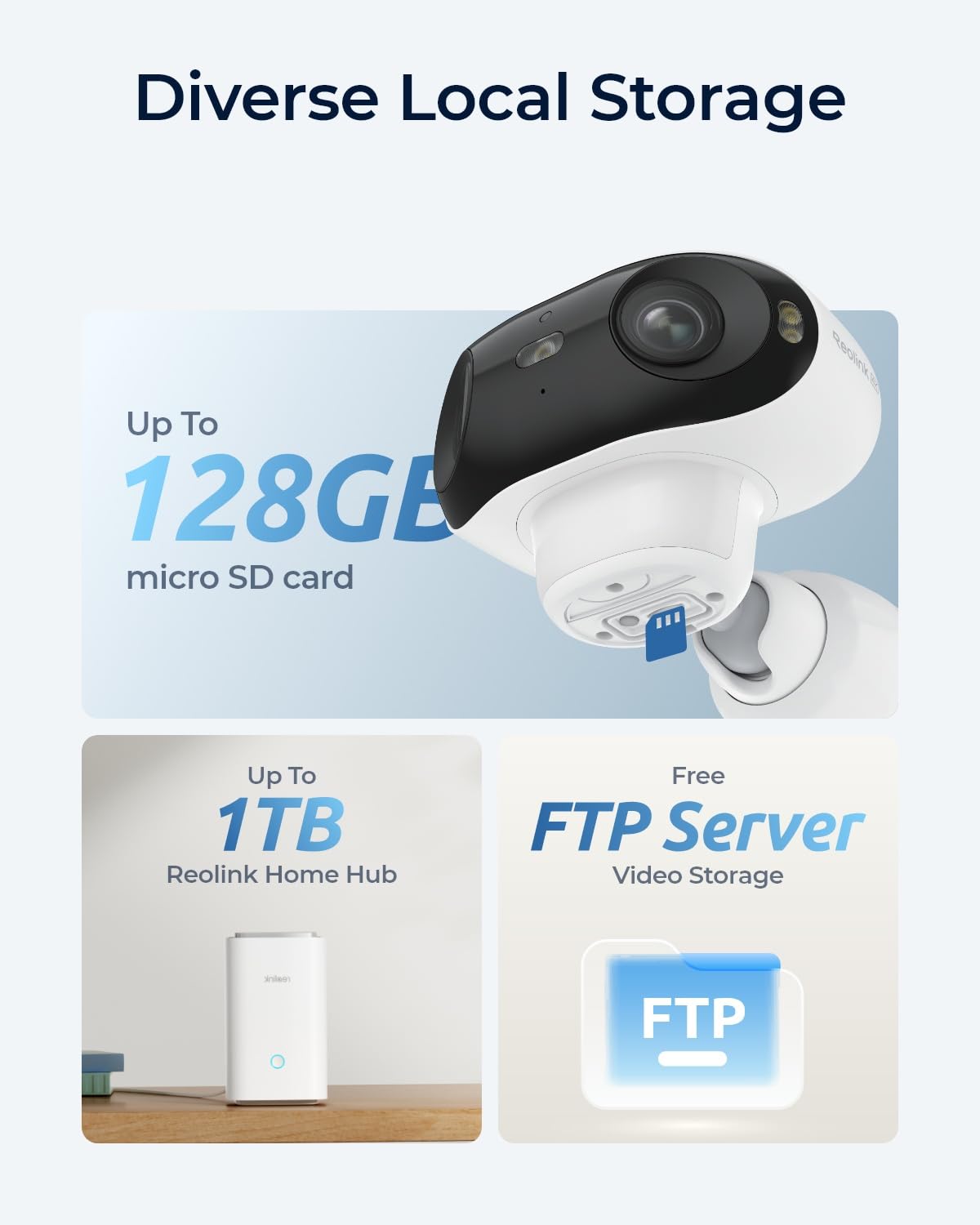 - 【Diverse Local Storage】 This security camera outdoor wireless supports multiple local storage options, including: microSD cards (up to 512GB), FTP servers, NAS & Reolink Home Hub