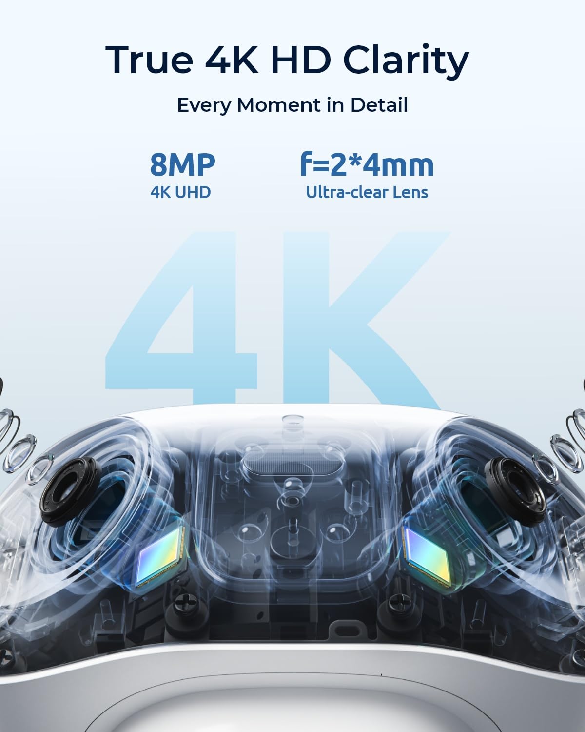 - 【4K UHD 180° Blindspot-free View】 This outdoor security camera delivers dual-lens stitched 180° 4K footage with minimal distortion, eliminating blind spots for complete property coverage.